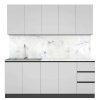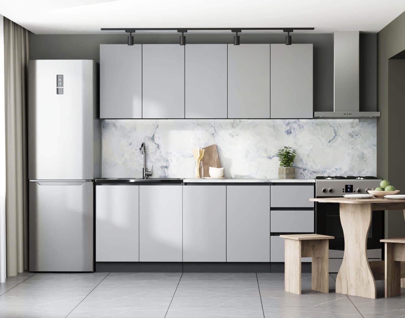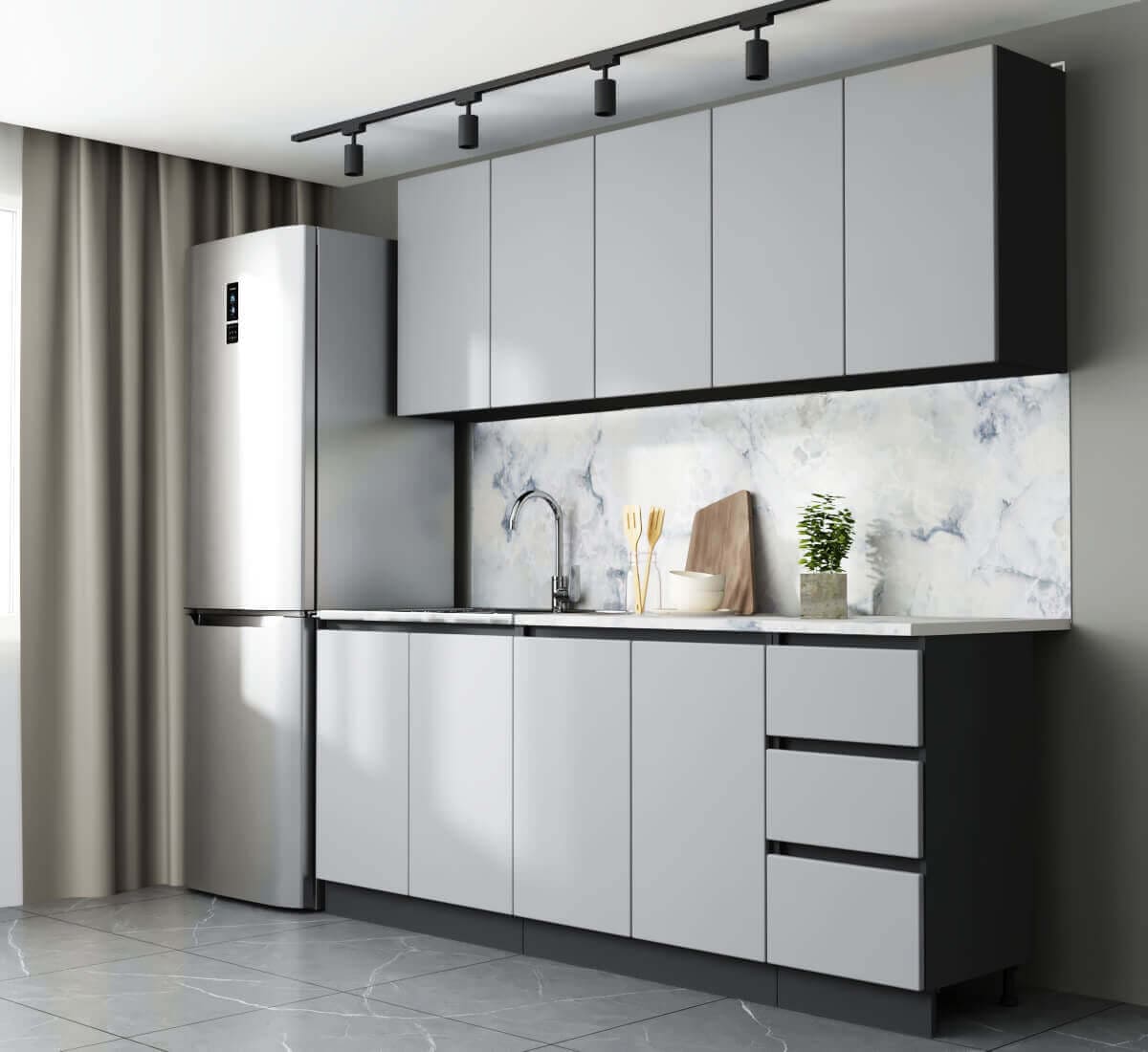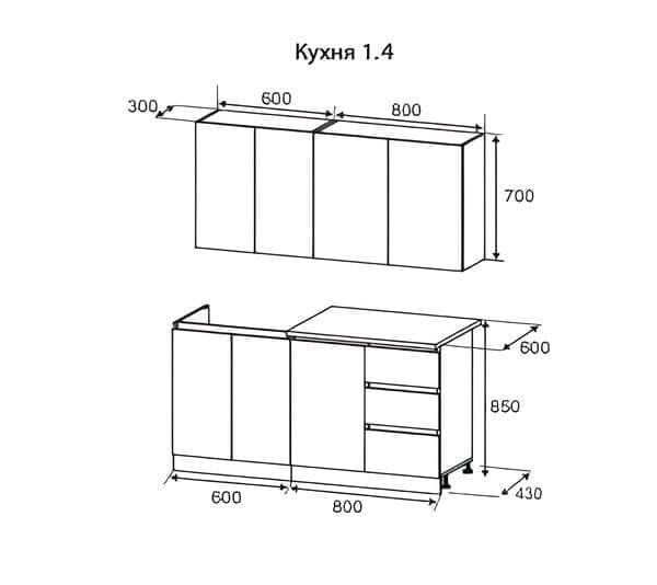 Гарнитур Мэри разработан с учетом типовых квартир: размерный ряд от 1,4 м до 2,0 м позволяет легко подобрать готовый комплект под вашу площадь. Но вы не ограничены стандартами: кухня модульная, и при необходимости к базовому набору можно заказать дополнительные верхние или нижние ящики. Это позволяет собрать кухню вашей мечты, задействовав всё полезное пространство.