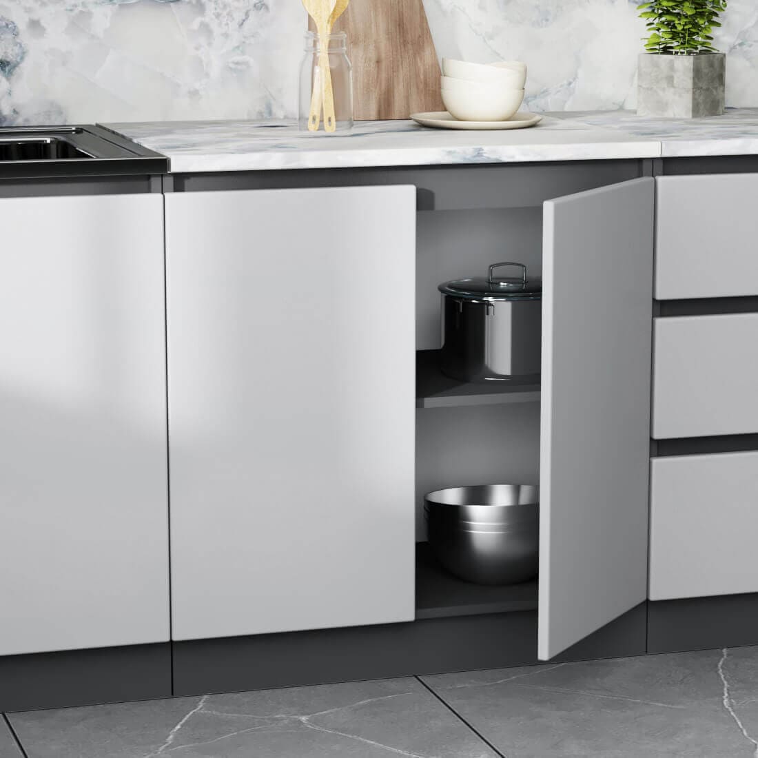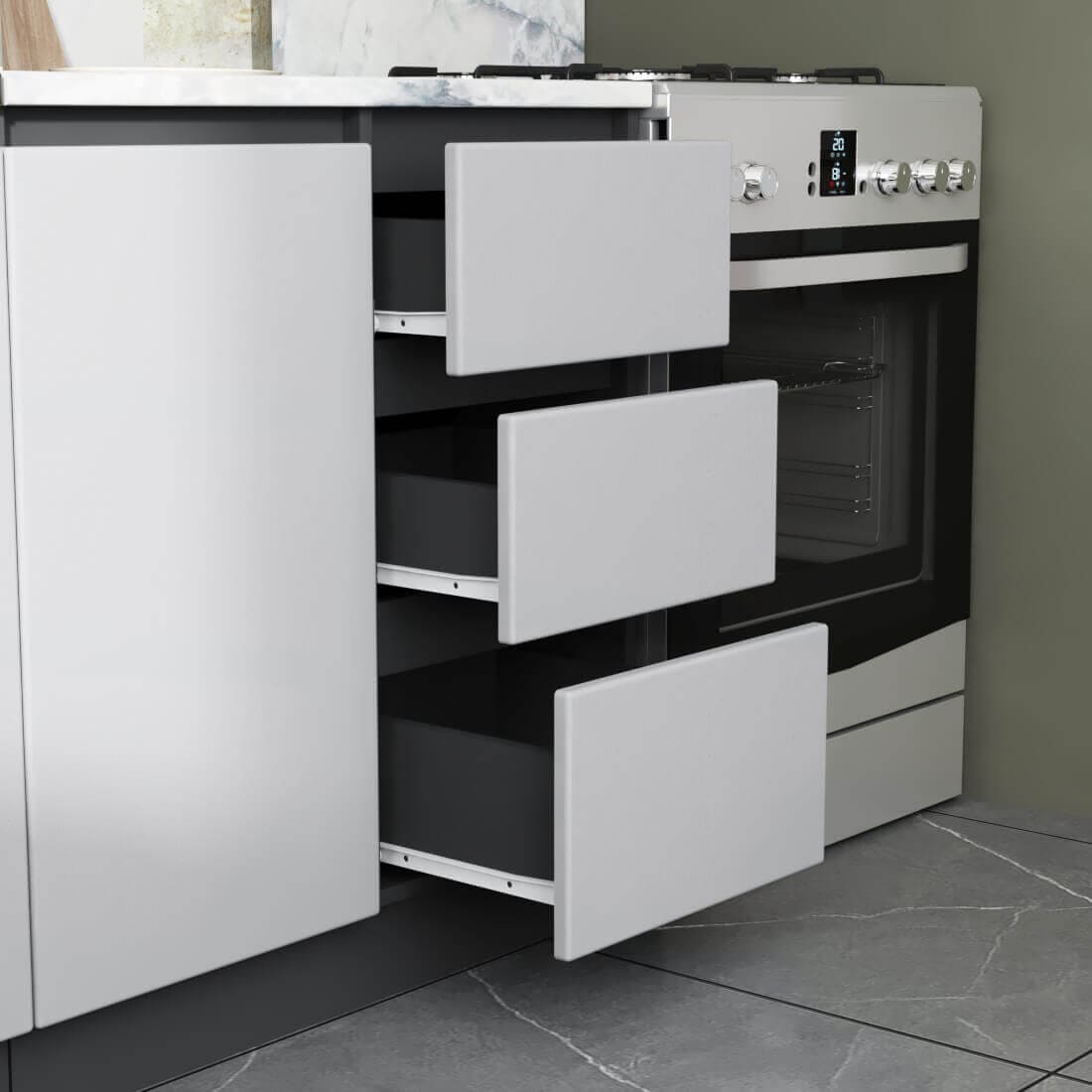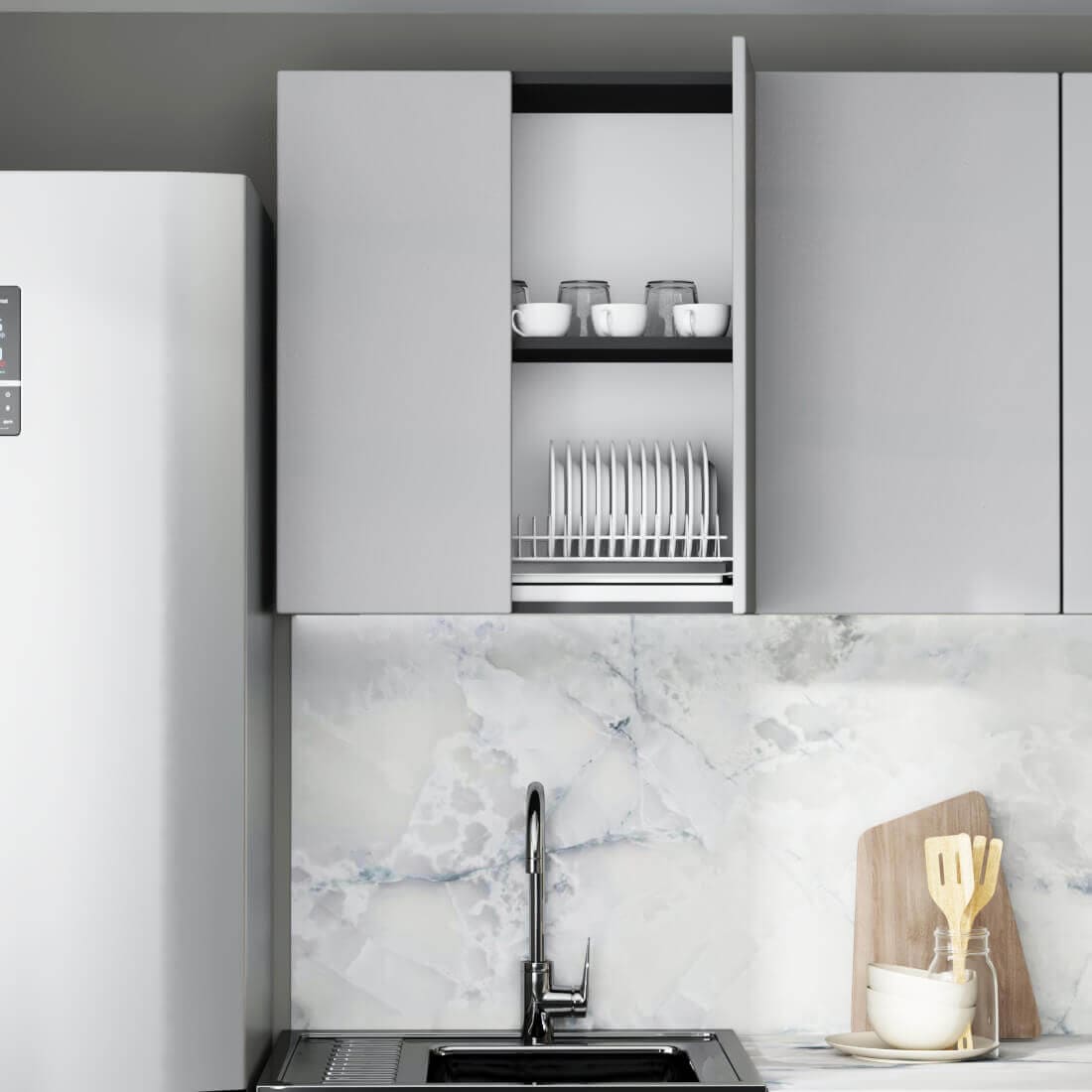 Гарнитур Мэри разработан с учетом типовых квартир: размерный ряд от 1,4 м до 2,0 м позволяет легко подобрать готовый комплект под вашу площадь. Но вы не ограничены стандартами: кухня модульная, и при необходимости к базовому набору можно заказать дополнительные верхние или нижние ящики. Это позволяет собрать кухню вашей мечты, задействовав всё полезное пространство.