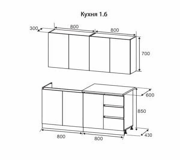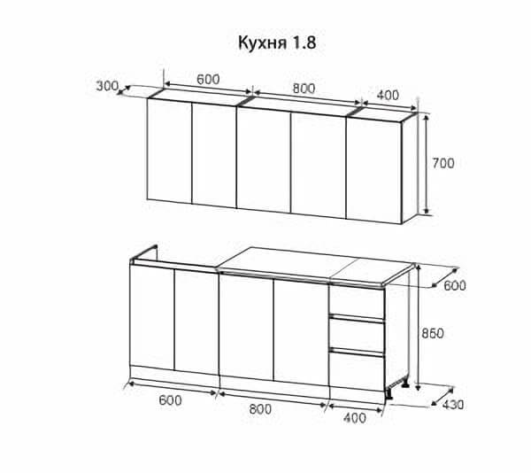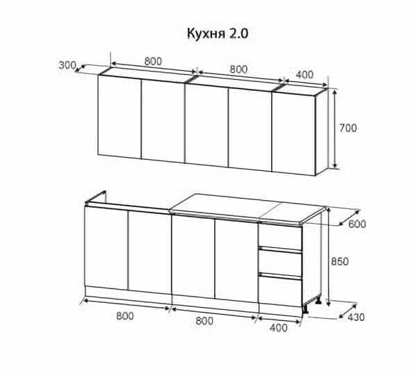 • Высота навесных верхних шкафов: 700 мм (без стекла).