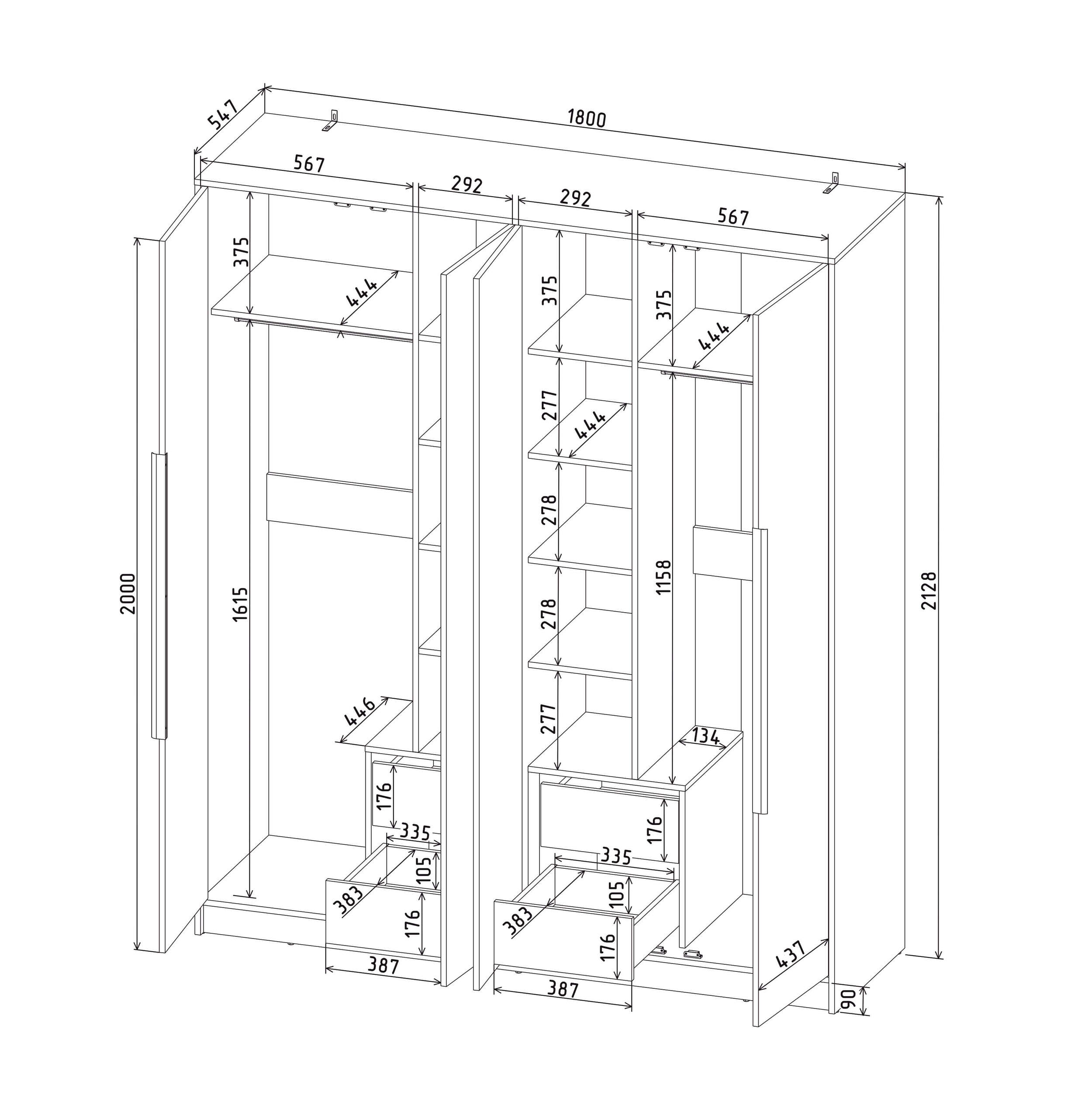 Шкаф с распашными дверями Концепт КТ-Ш4 Тренд — это стильный шкаф с четырьмя распашными дверьми и большими зеркалами, который идеально подойдет для организации вашего пространства. Внутри вы найдете удобные штанги для одежды, прочные полки для хранения аксессуаров и вещей, а также вместительные ящики для мелочей, которые помогут организовать хранение вещей для двоих. Зеркала визуально расширят пространство, а надежная конструкция и современный дизайн делают этот шкаф отличным выбором для любой спальни или организации гардеробной.