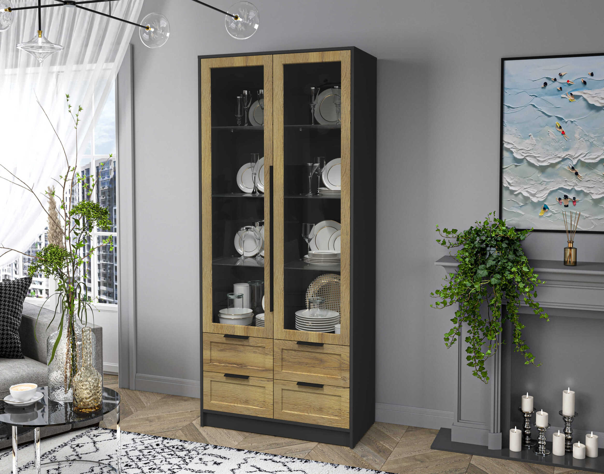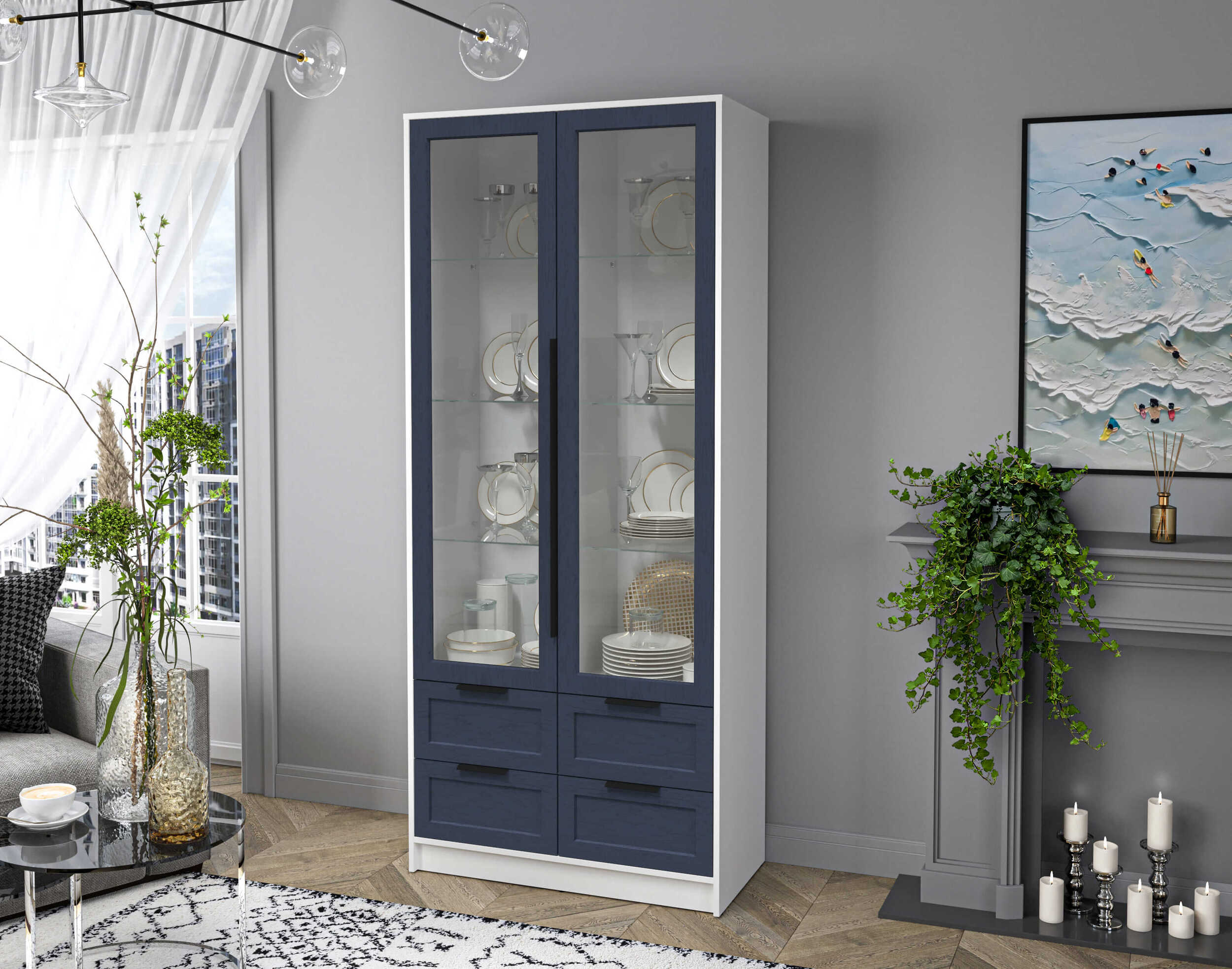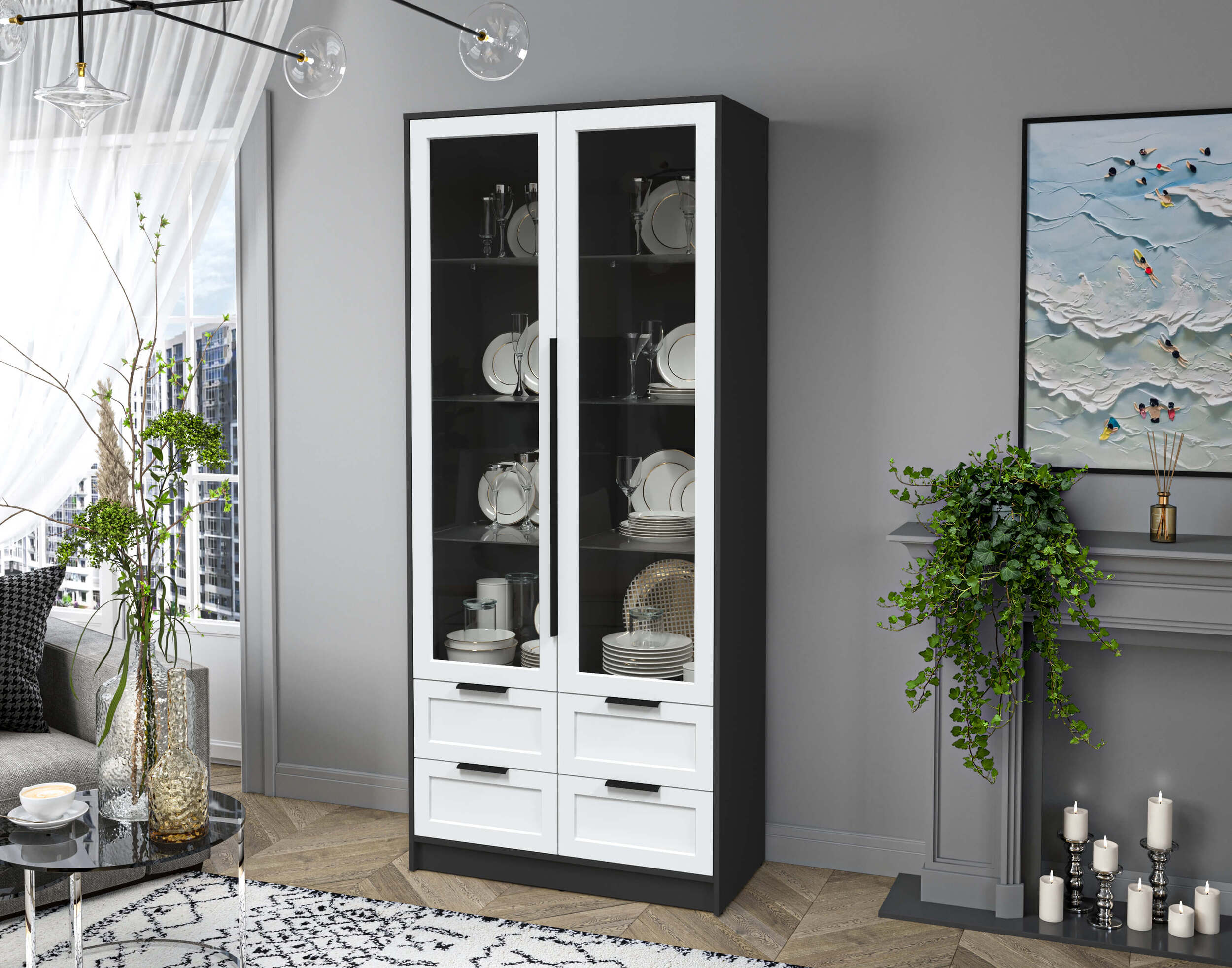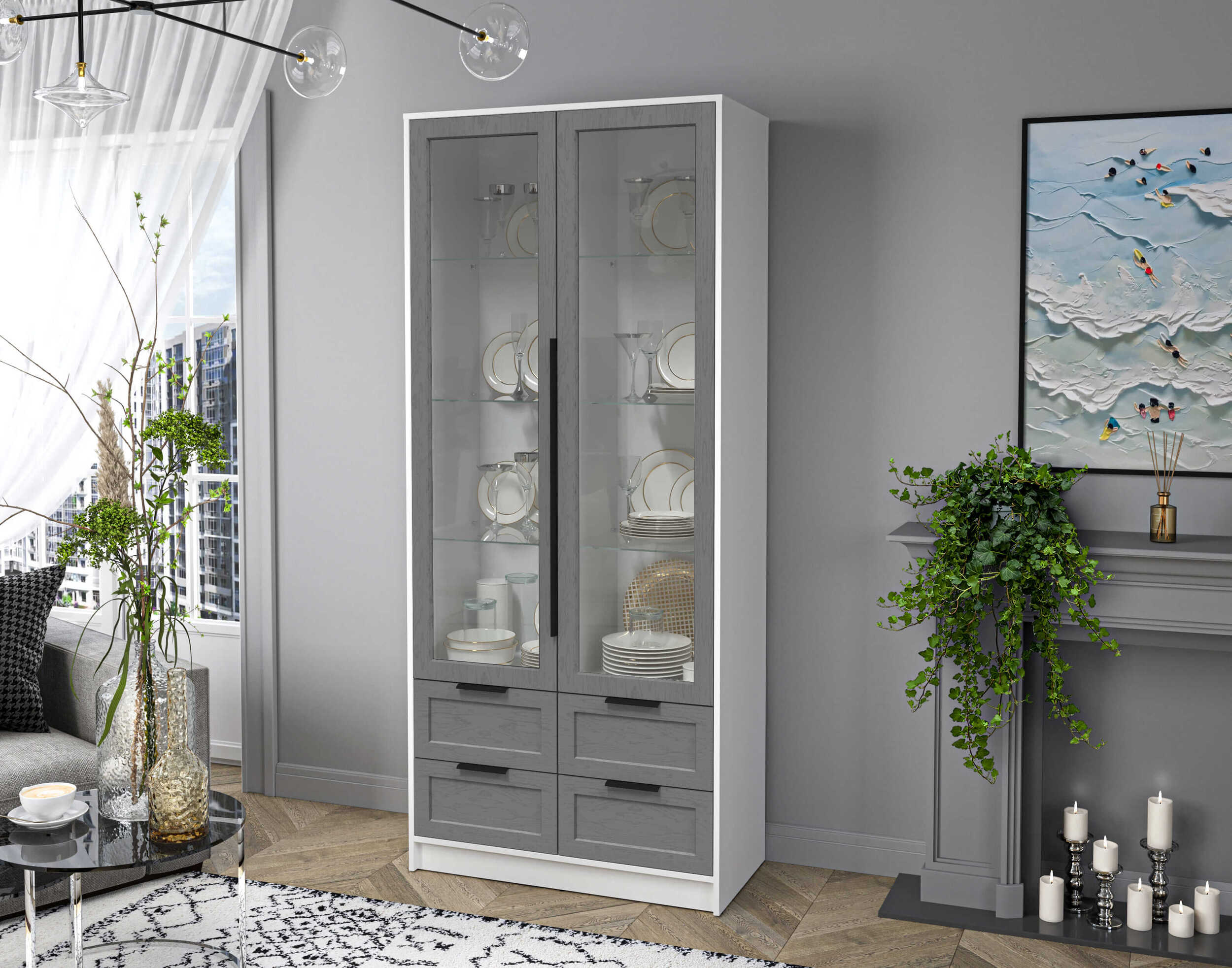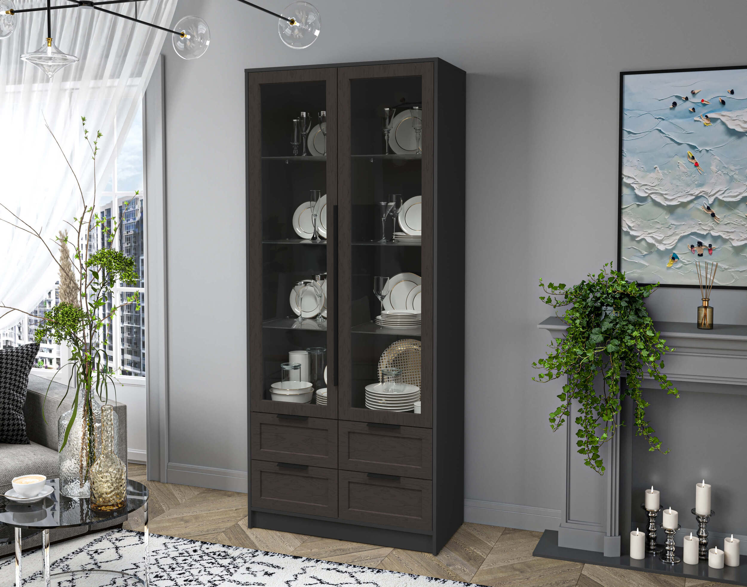 Шкаф с распашными дверями с витриной Концепт КТ-ШВ2 Тренд — это шкаф-витрина с 4 выдвижными ящиками снизу. Он сочетает декоративность и функциональность. Витрина обеспечивает прозрачную демонстрацию посуды и мелочей. Нижние ящики предлагают удобное скрытое хранение. Каркас выполнен в современном стиле с красивым дизайном корпуса, он легко впишется в разные интерьеры. Подходит для гостиной, кухни и столовой. Идеально для тех, кто ценит порядок и элегантность.
